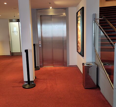 Gäste mit Rollstuhl werden zu einem Treffpunkt geführt, von dem aus sie gemeinsam zu den Rollstuhlplätzen im Saal geleitet werden. Der Zugang ist über den Seiteneingang.