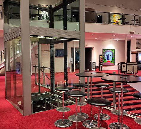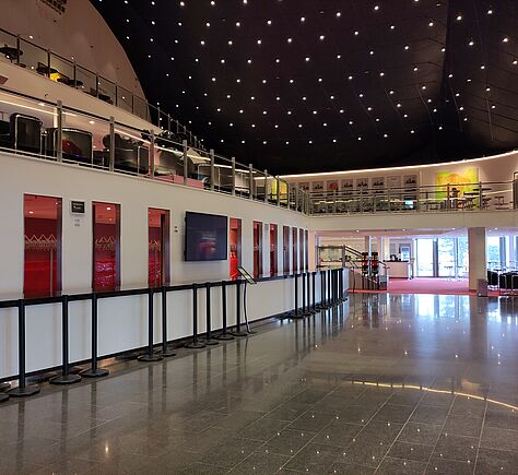 Infrarotkopfhörer-Bügel werden im Foyer gleich neben dem Eingang ausgegeben. Der Empfang funktioniert auf allen Plätzen.