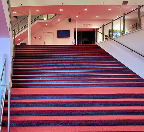 Zugang zum Rang über 2 weitere Treppen. Zunächst 22 Stufen bis zum Foyer oben, 15 cm Stufenhöhe, dann im Inneren des Saales noch einmal 15 Stufen, 18 cm Stufenhöhe. Handläufe überall beidseitig.